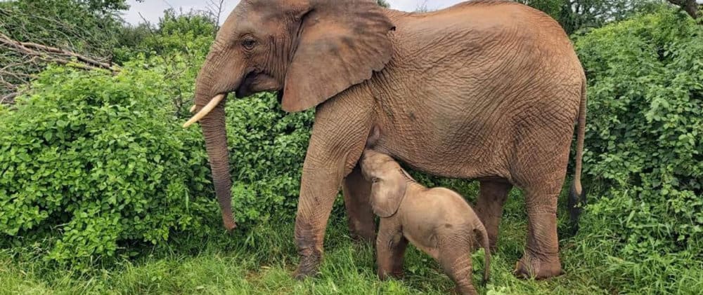 Kofi, the 46th known offspring of an orphaned elephant reintegrated into the wild, thrives under Kilabasi’s care.