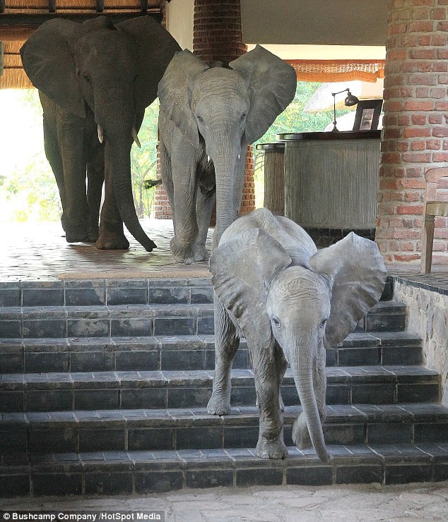 The young elephants, strolling through the lodge’s reception area, attract the attention of onlooking staff members, creating charming scenes of coexistence.