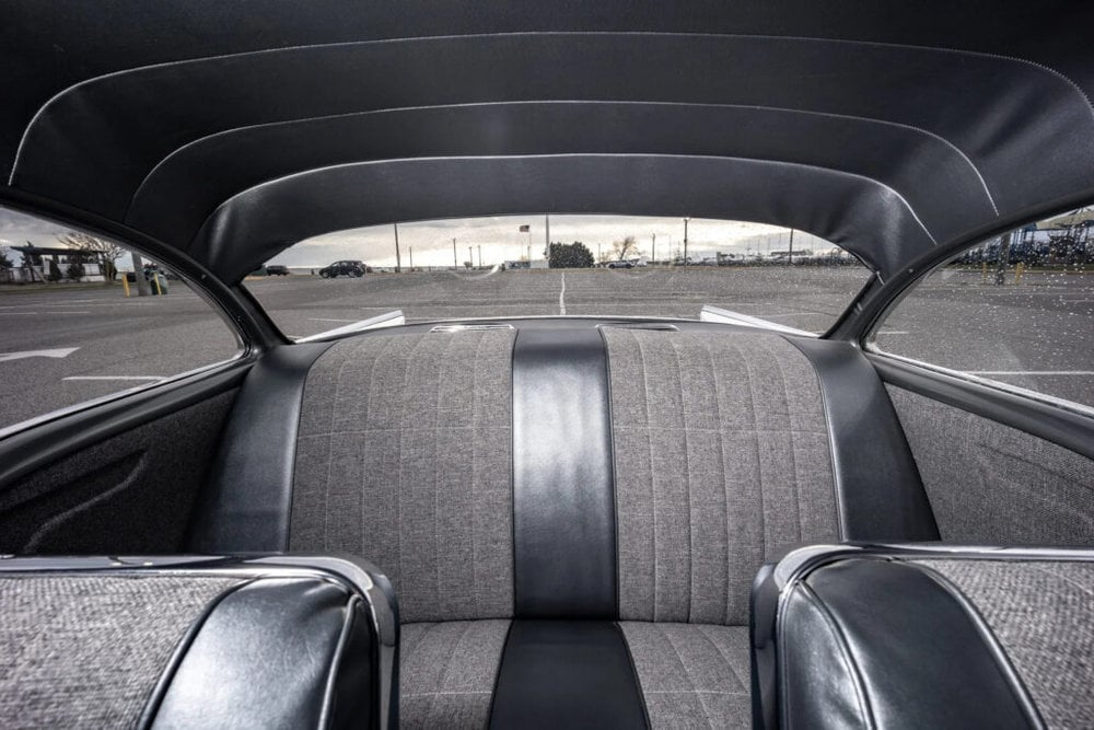 The 210 boasts a custom interior featuring gray vinyl bucket seats and a rear bench with period-correct cloth inserts inside.