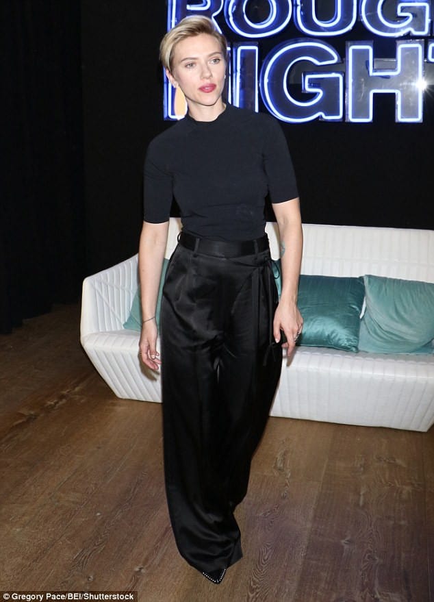 She paired a black t-shirt with glossy wide-leg trousers, complementing her distinctive short-cropped blonde hair, which was neatly parted on the left. Johansson’s makeup was subtle, except for a pop of crimson lipstick that added a touch of glamour to her look.