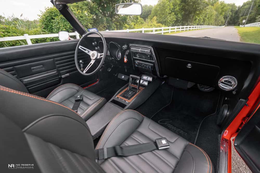 The exterior exudes timeless elegance, boasting impeccable panel gaps and mesmerizing body lines accentuated by Hugger Orange paint and black racing stripes.