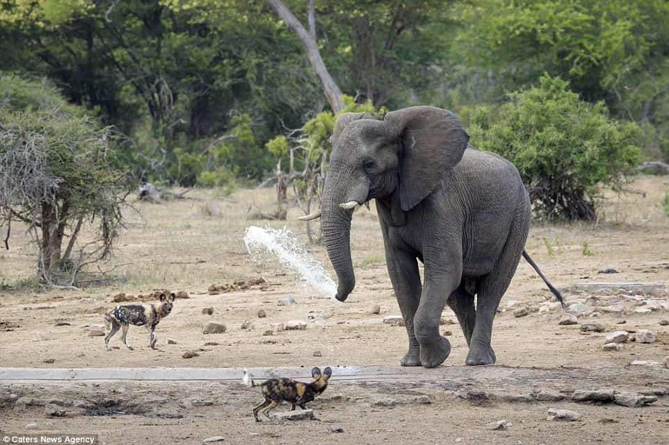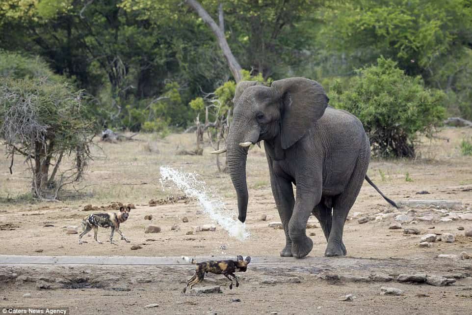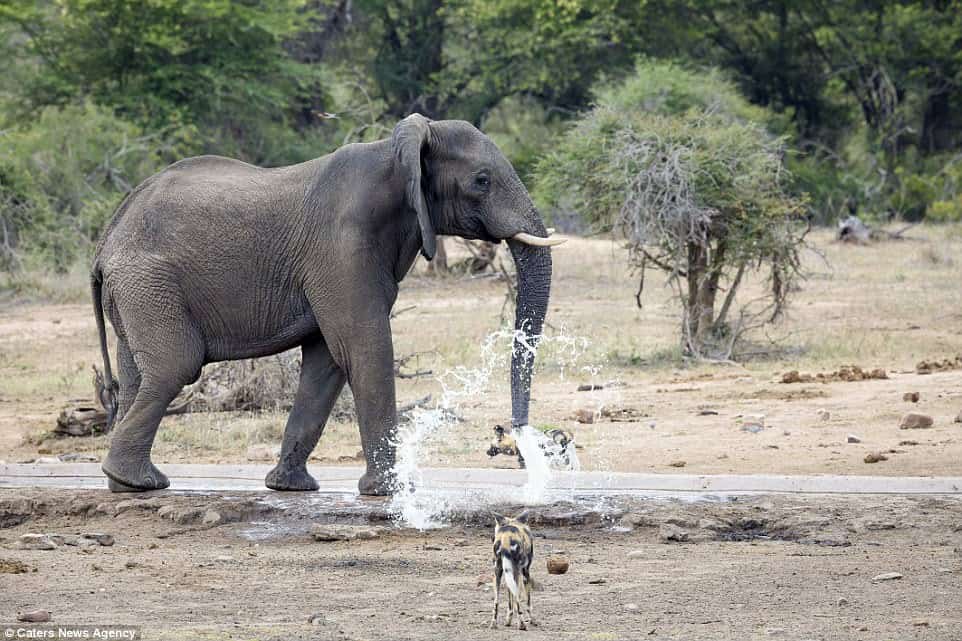 In a captivating scene at the Welverdiend waterhole in Kruger National Park, South Africa, a resourceful elephant showcased a unique response to a group of wild dogs, using its trunk as a makeshift water cannon.