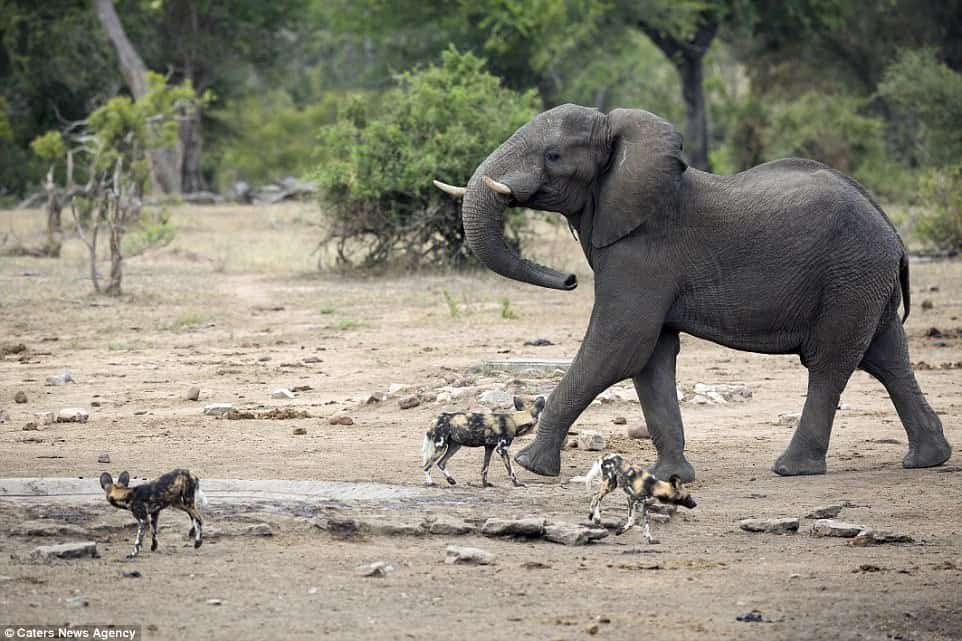 Despite the playful antics of the wild dogs, inching closer to test boundaries, the elephant reached a point of weariness.
