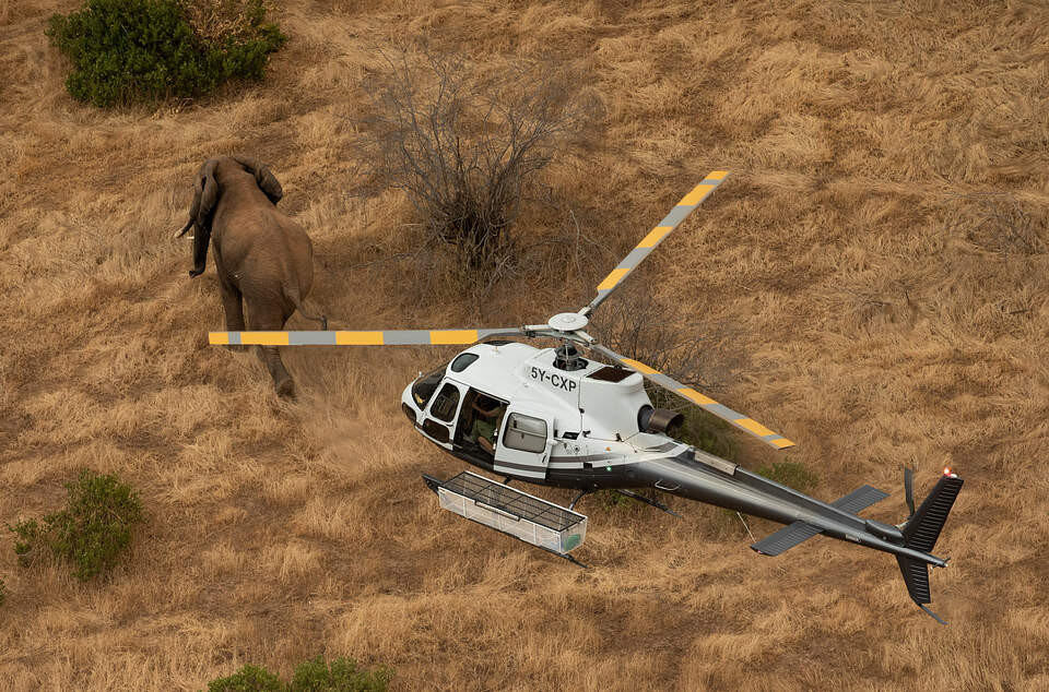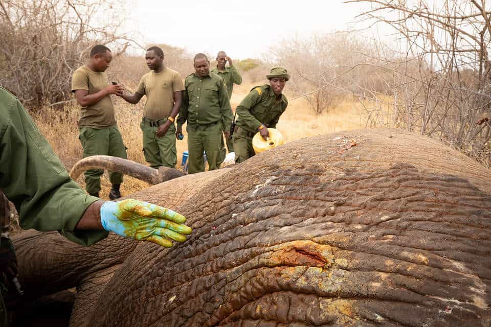 Two days later, the team successfully located the bull again with the helicopter back in action. A coordinated effort involving aerial and ground crews, led by Dr. Poghon from the SWT/KWS Tsavo Mobile Vet Unit, ensued.